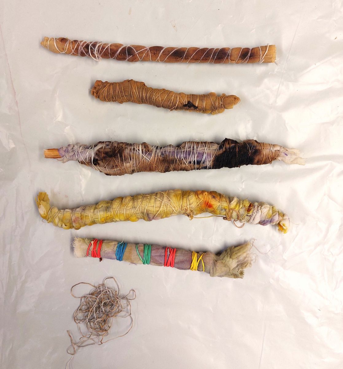 Puis, nous avons plié, froissé, emballé, plantes, fleurs et clous rouillés pour créer des motifs organiques et imprévisibles traces de nos gestes réfléchis ou improvisés. Nous avons expérimenté la peinture au sulfate de fer pour créer des imprimés spontanés par oxydation.