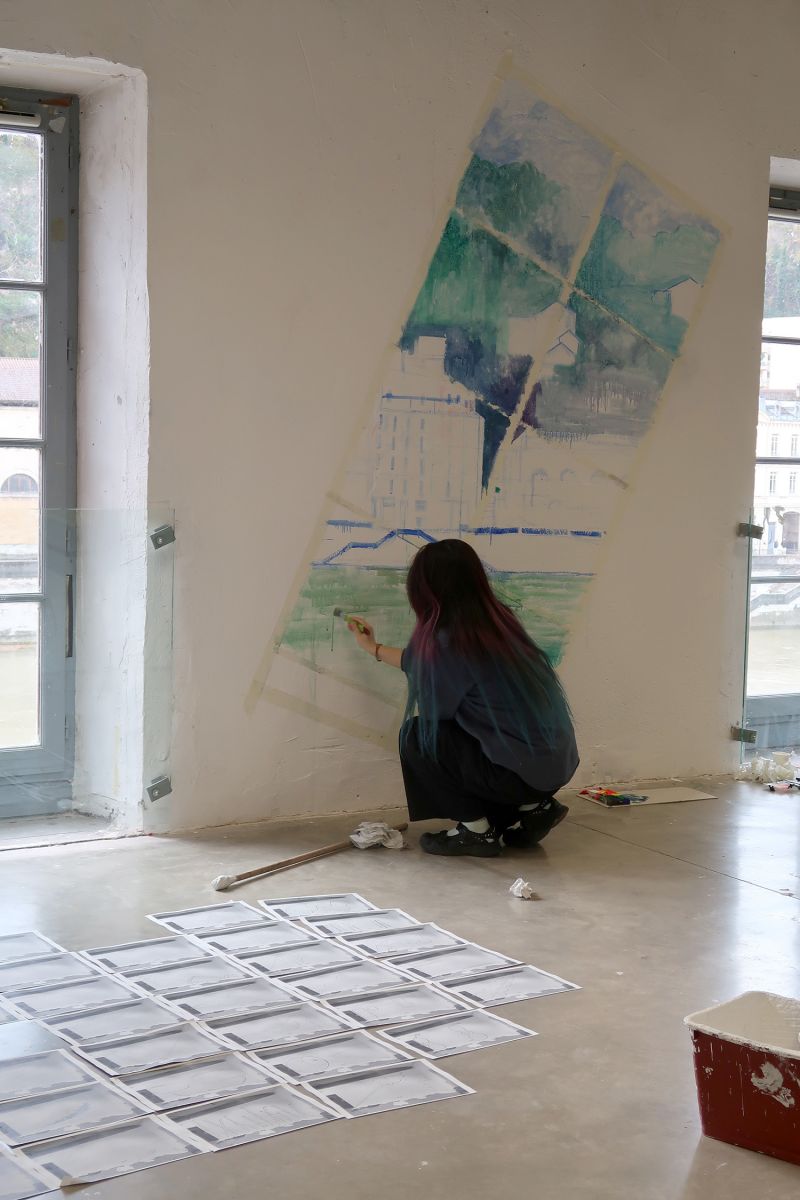 Durant la semaine, le mardi et le jeudi soir sera présenté sur le mur de la cafétéria une peinture murale combinant peinture directe, peinture déjà réalisée en collectif. Il s'agira d'utiliser la peinture, toutes ses ressources pour produire deux fois dans la semaine une peinture témoignant de la singularité de ce médium, d'en profiter pour interroger sa pertinence à rendre compte d'une autre façon de faire récit. Collectivement sera établi une hypothèse de composition qui sera réalisée ensemble, le mardi puis elle sera recouverte afin d'en produire une autre, le jeudi.